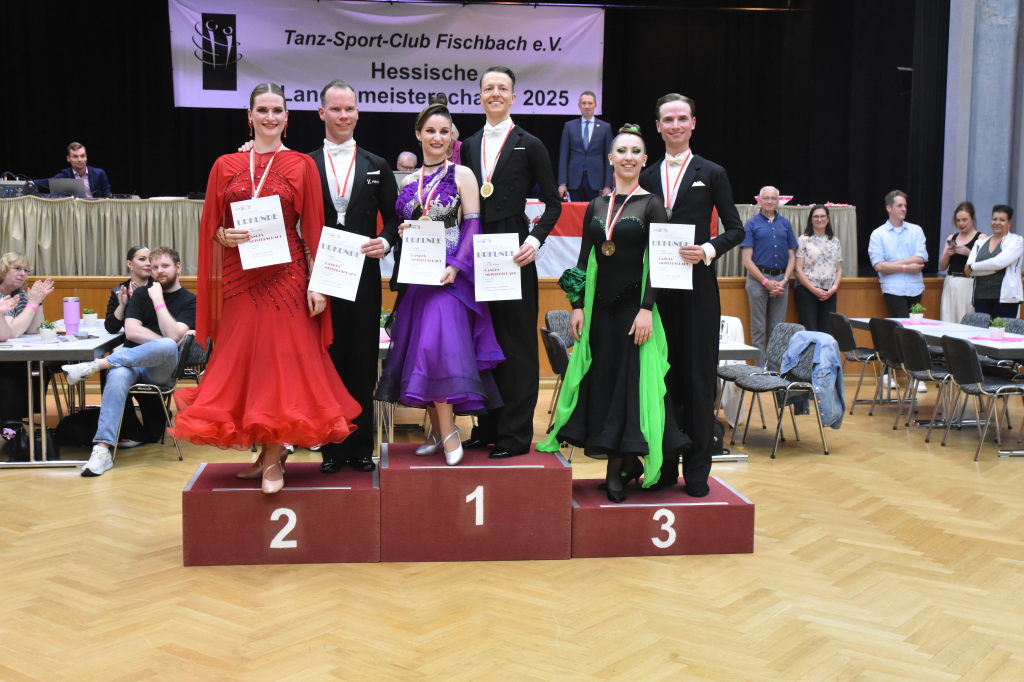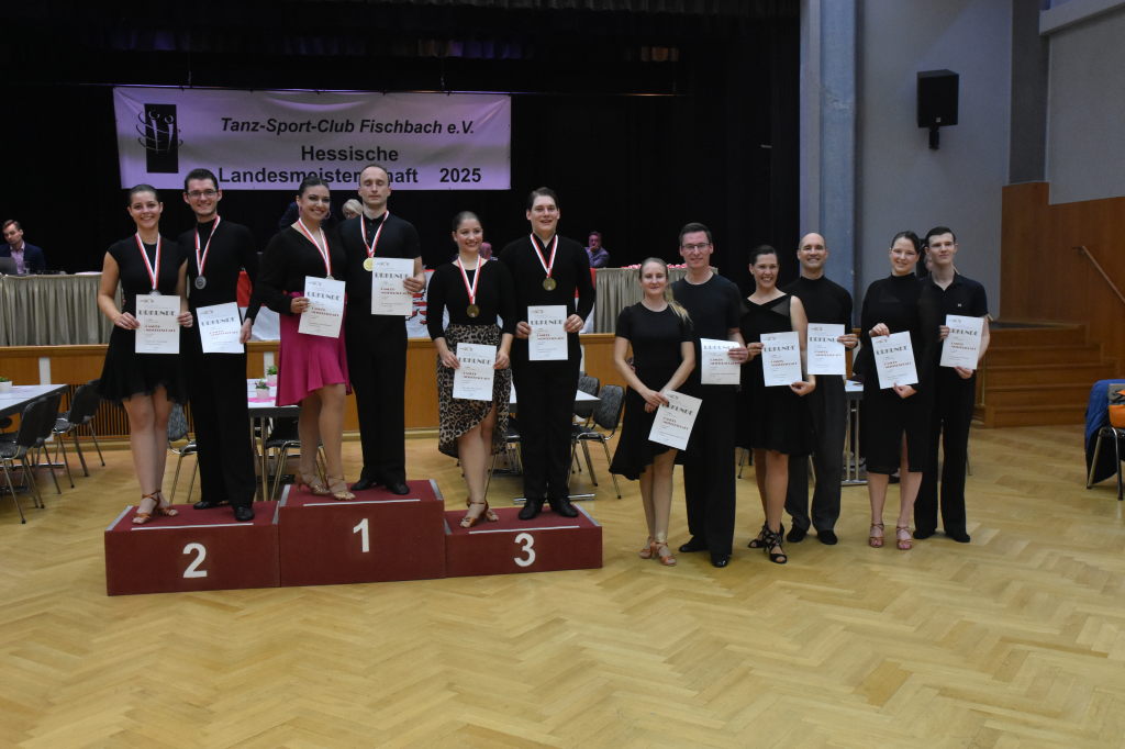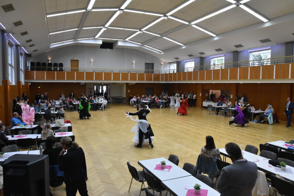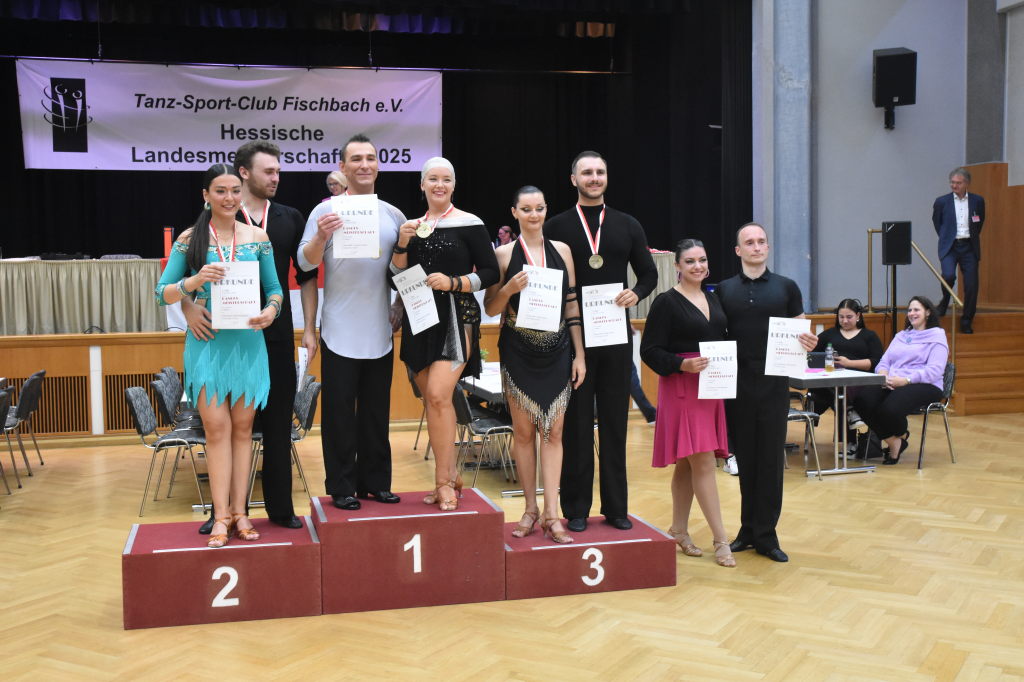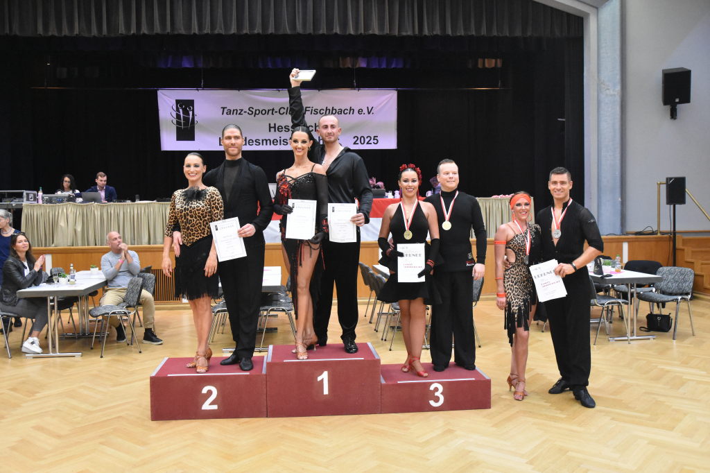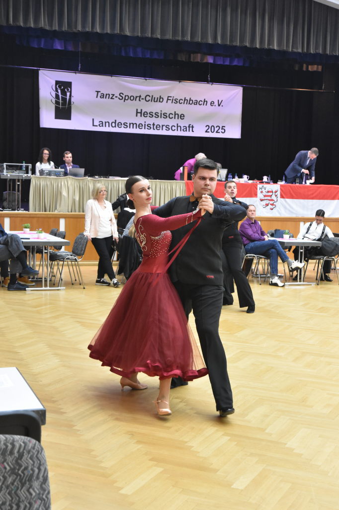 Während der Regen am Sonntagmorgen noch auf das Dach der Stadthalle prasselt, ertönen aus der Halle ganz andere Rhythmen: sechs Turnierpaare der Hauptgruppe II D-Latein tanzen sich zu den Klängen von Samba, Cha Cha Cha, Rumba und Jive ein, um bei den Hessischen Landesmeisterschaften 2025 einen Platz auf dem Siegertreppchen und vielleicht den Aufstieg in die nächsthöhere Klasse zu erringen.