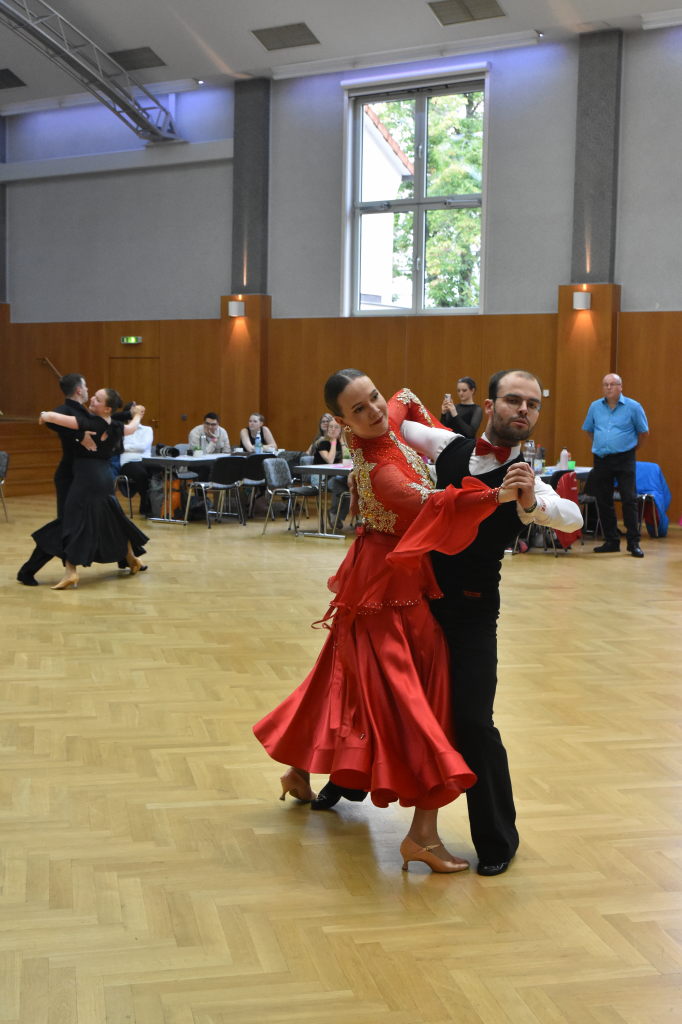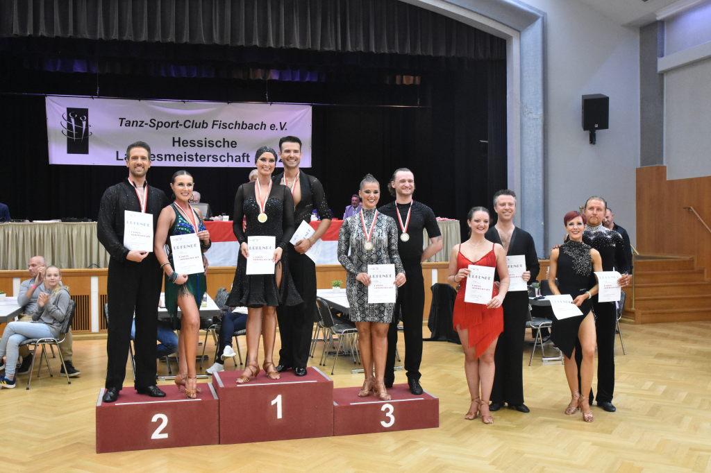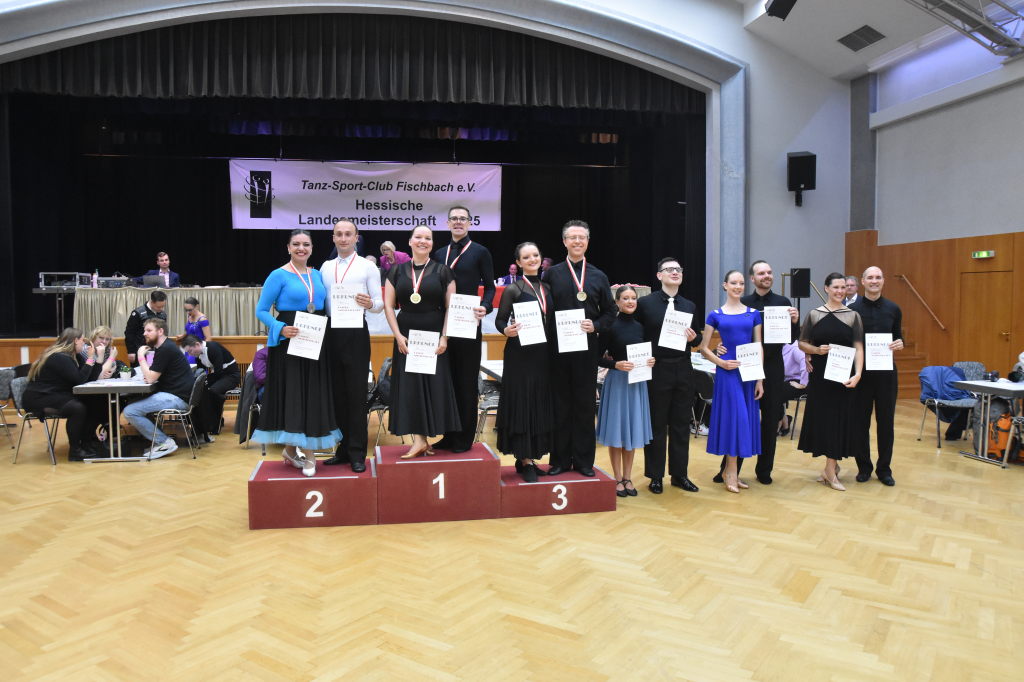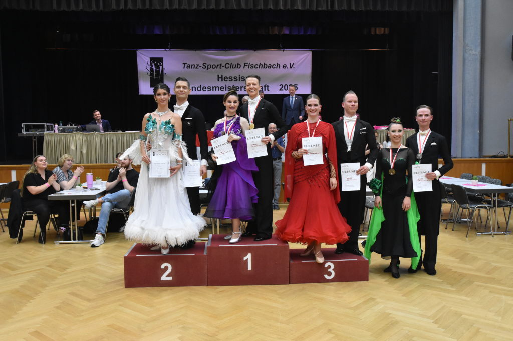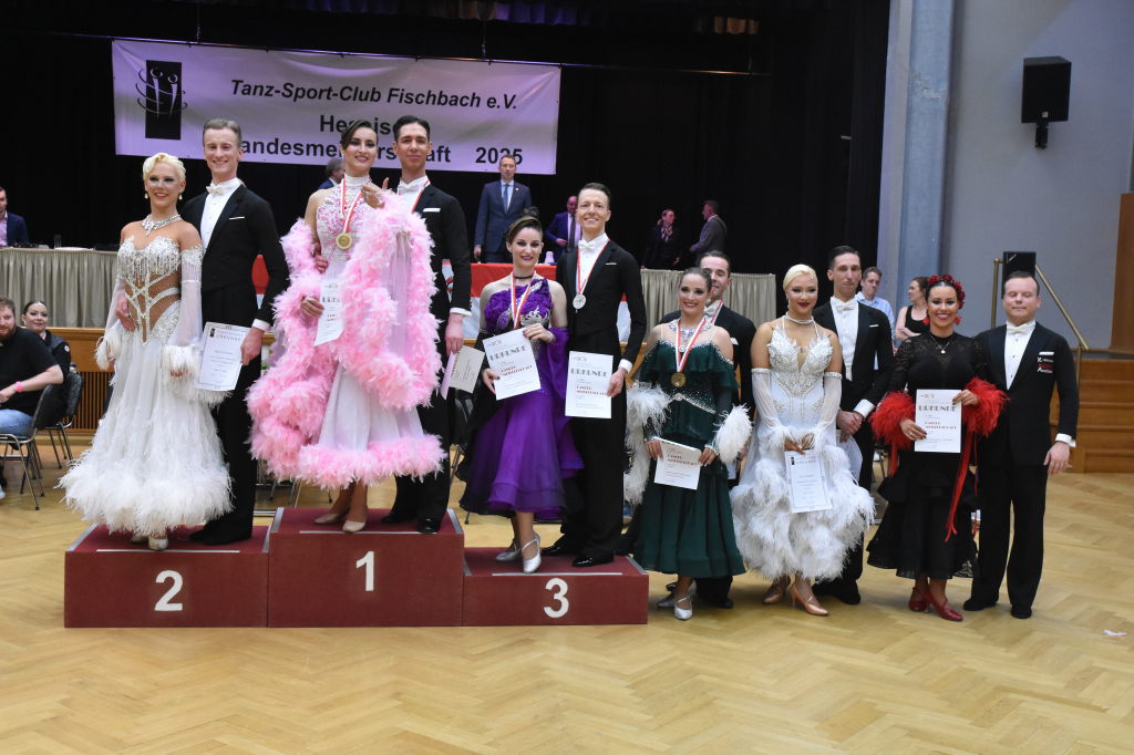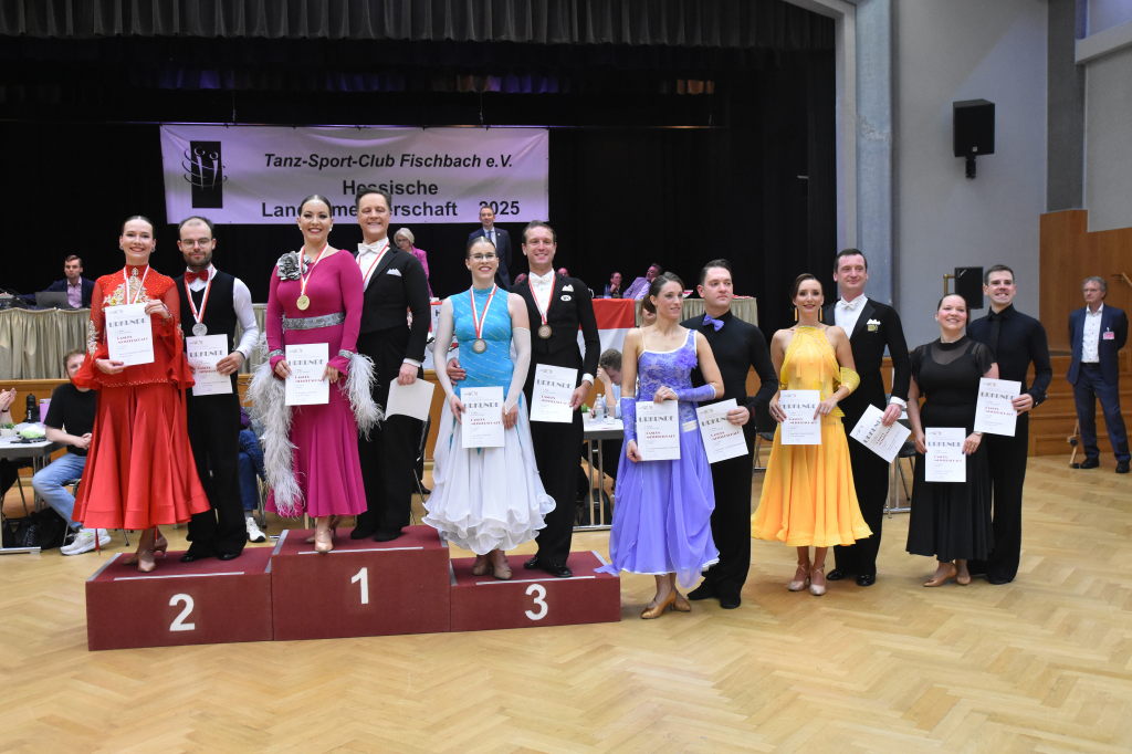 Während der Regen am Sonntagmorgen noch auf das Dach der Stadthalle prasselt, ertönen aus der Halle ganz andere Rhythmen: sechs Turnierpaare der Hauptgruppe II D-Latein tanzen sich zu den Klängen von Samba, Cha Cha Cha, Rumba und Jive ein, um bei den Hessischen Landesmeisterschaften 2025 einen Platz auf dem Siegertreppchen und vielleicht den Aufstieg in die nächsthöhere Klasse zu erringen.