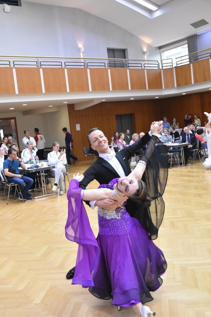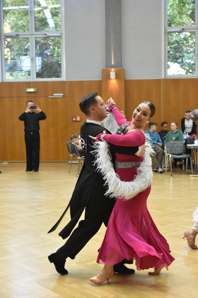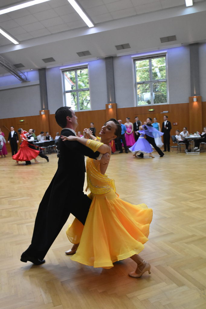 Im zweiten Teil des Turniers kämpfen die Paare um die Medaillen in Standard. Jetzt sind die Kleider der Damen lang und bestechen durch leuchtende Farben in blau, pink, gelb oder türkis, auch an Federn und Pailletten wird nicht gespart.
