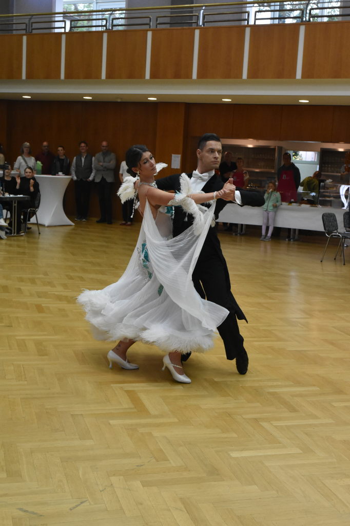 Und hier gelingt Vanessa und Christian Bolz aus Frankfurt die Überraschung des Tages: Sie erreichen in der ersten Runde in der Klasse D-Standard den ersten Platz, dürfen damit in der nächsten Runde in der C-Klasse antreten, wo sie die Wertungsrichter ebenfalls mit ihrer Leistung überzeugen, so dass sie direkt in der B-Klasse antreten können. Nach diesem Marathon antwortet Vanessa auf die Frage, wie sich das anfühlt mit „Wahnsinn!“ Ein großes Lob hat sie für die anderen Tanzpaare, das nette Publikum und für die ausgezeichnete Musik. Diesem Lob fügt Kai Jungbluth, der die zweite Halbzeit moderiert, ein dickes Lob für die ausgezeichnete Organisation durch den TSC Fischbach und die vielen Helfer an, die zum reibungslosen Ablauf beigetragen und für die Bewirtung gesorgt haben.