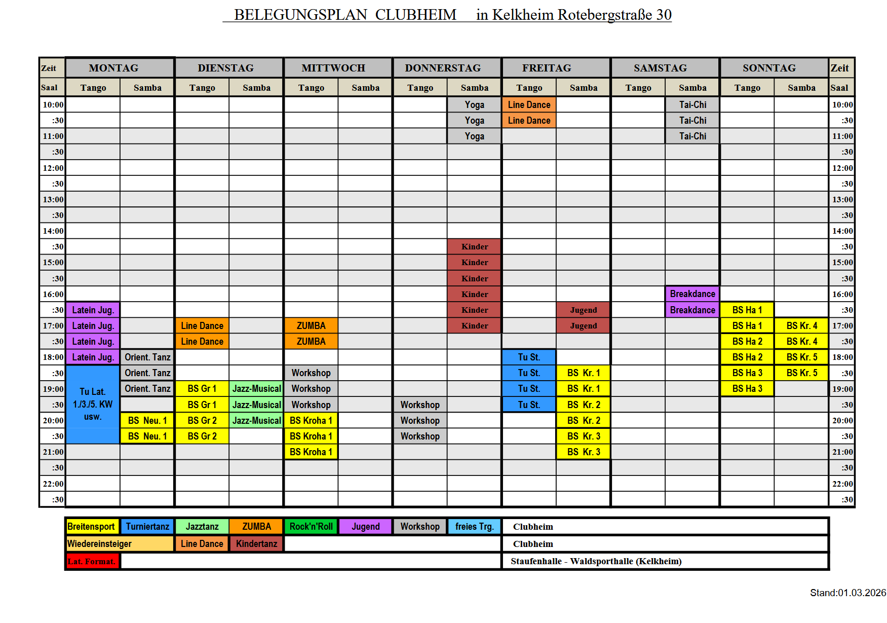 In unserem dynamischen Belegungsplan (Google Kalender) werden alle aktuellen Belegungen und Hinweise zu Trainingsausfällen und freien Trainingsmöglichkeiten hinterlegt. Der Kalender kann auch abonniert werden, so dass Ihr / Sie stets aktuell informiert werdet.